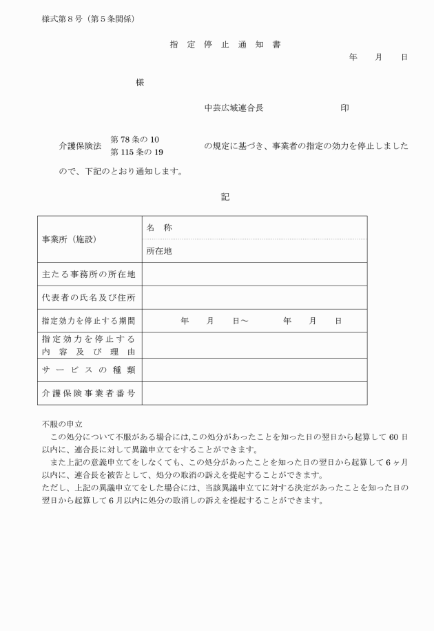 第5条 連合長は、法第78条の10第1項及び第115条の19の規定による指定を取り消したときは、指定取消通知書(様式第7号)により、当該指定地域密着型サービス事業者及び当該指定地域密着型介護予防サービス事業者(以下この条において「指定地域密着型サービス事業者等」という。)に通知するものとする。