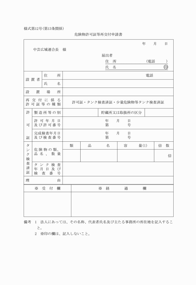 第3条 連合長は、法第11条第1項の規定による製造所、貯蔵所又は取扱所(以下「製造所等」という。)の設置又は変更の許可申請があった場合において、その製造所等の位置、構造、設備が法第10条第4項の技術上の基準に適合し、かつ、当該製造所等においてする危険物の貯蔵又は取扱いが公共の安全の維持又は災害の発生の防止に支障を及ぼすおそれがないものであるときは、許可証(様式第3号)を申請者に交付するものとする。