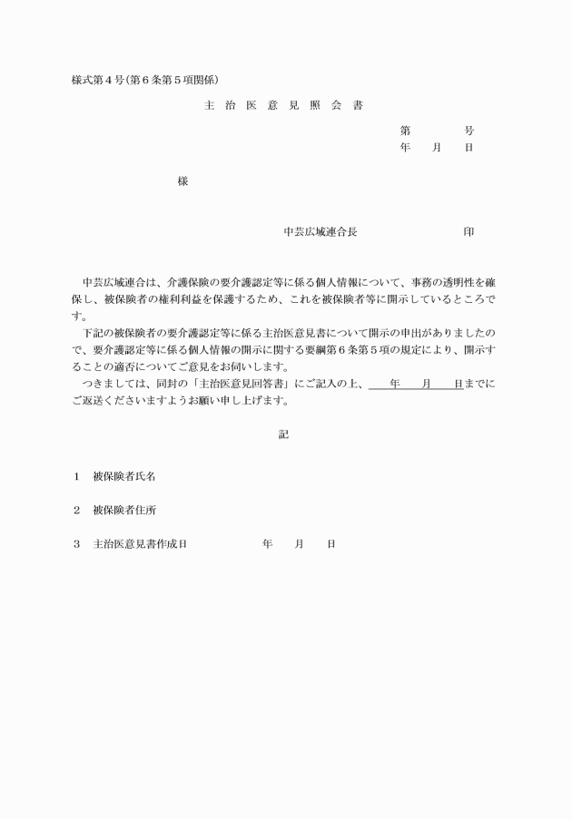 第4条 開示の申出をしようとする者は、連合長に対して、要介護認定等に係る個人情報開示申出書(様式第1号。以下「開示申出書」という。)を提出しなければならない。